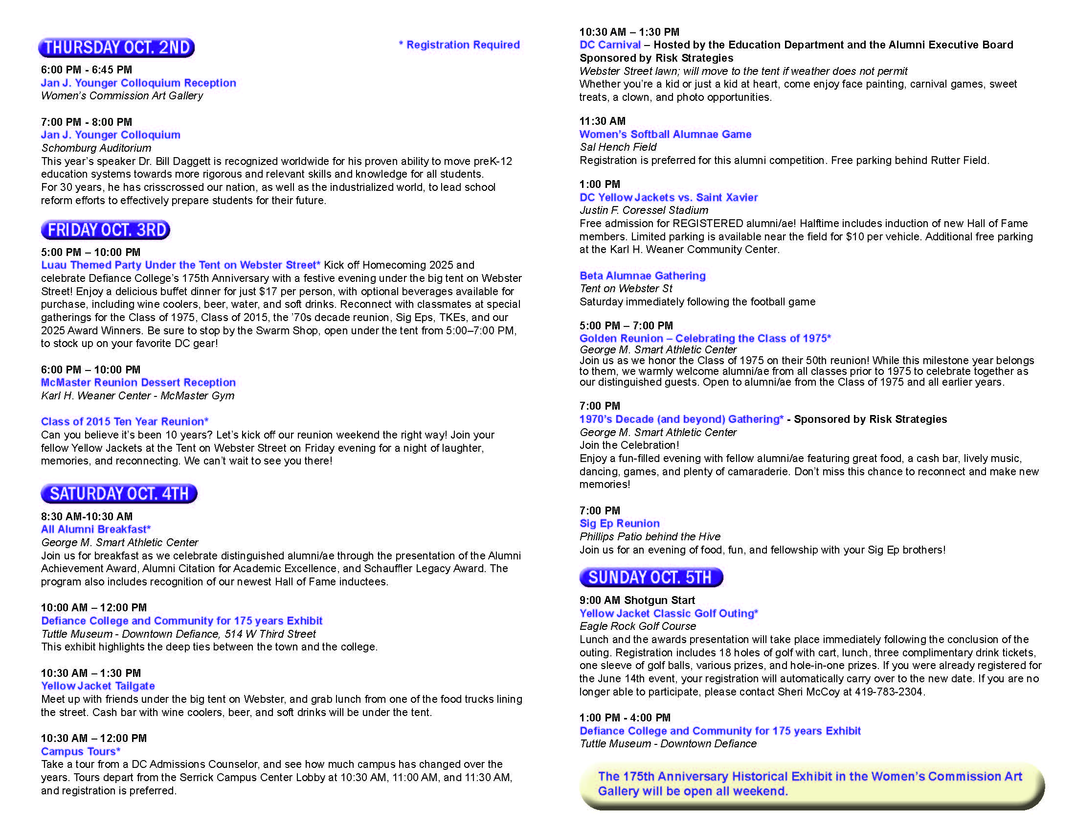 Homecoming at Defiance College is more than a weekend of events—it’s a celebration of tradition, connection, and Jacket Pride. This year, as we mark 175 years of Defiance College, we are especially excited to welcome back alumni, friends, and the community for a weekend filled with memories, laughter, and new moments to cherish. From time-honored traditions like the Student vs. Staff Softball Game and Yellow Jacket Tailgate, to class reunions, award celebrations, and the home football game, Homecoming is a chance to reconnect with the people and the place that shaped so many lives. Join us in celebrating the past, honoring the present, and looking ahead to the future of Defiance College.