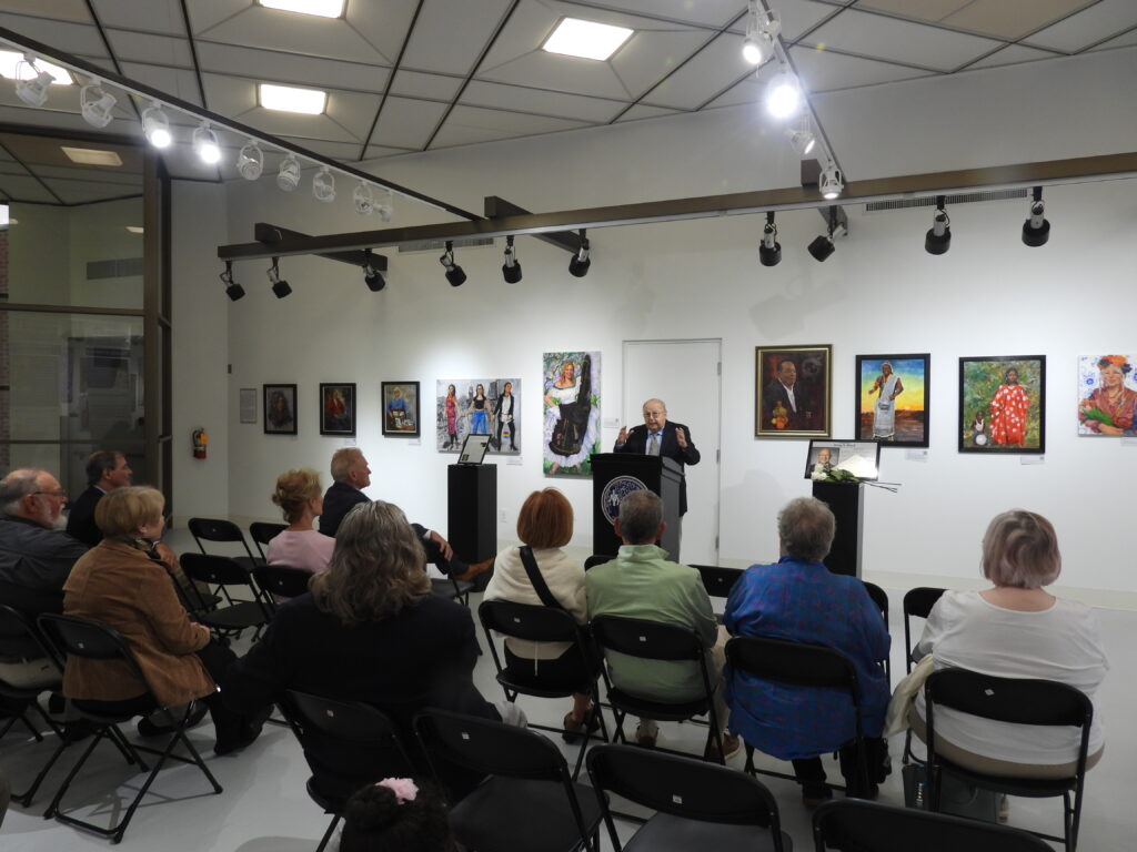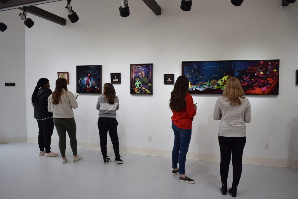The WCG is one of the largest rotating art galleries in the area with 1,044 square feet of floor space. It features an open floor plan, 12′ walls, a vaulted ceiling, track lighting, floor-to-ceiling interior and exterior windows, and a courtyard.